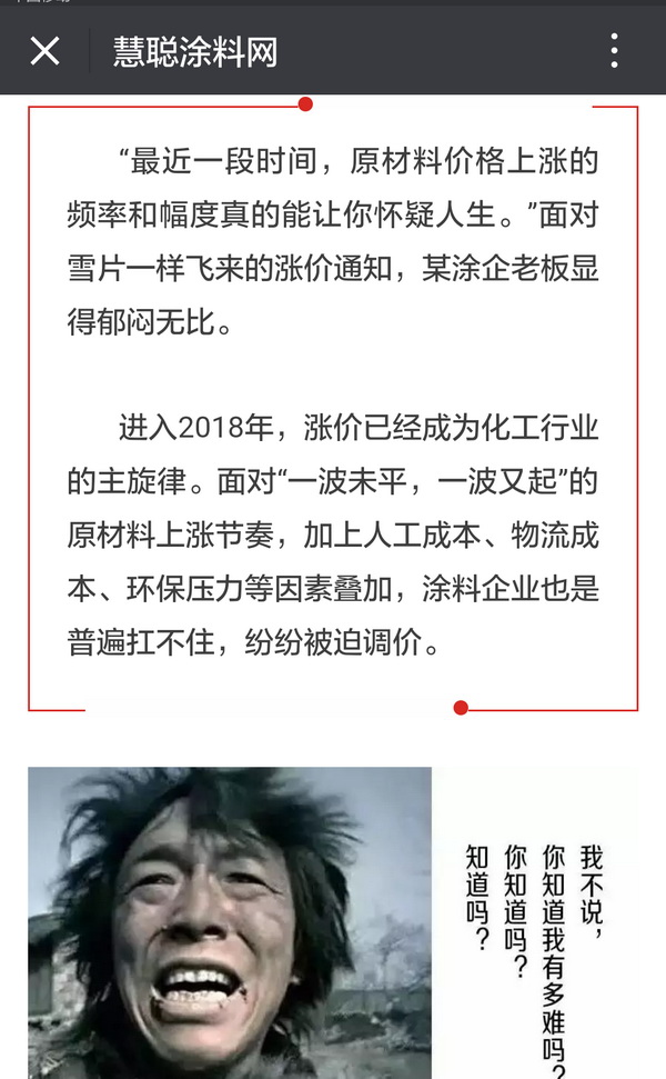 2017年,伊人婷婷视频漆企業最難熬的一年,在這一年,原材料價格的持續上漲,部分價格漲幅甚至超過了100%,讓許多企業不堪重負,超過三分之一的企業處於虧損狀態。在2018年春節過後,原材料又將再次迎來一波漲價潮,企業應該如何應對,如何在這個艱難的時刻挺過去,找到生存之道並發展壯大。